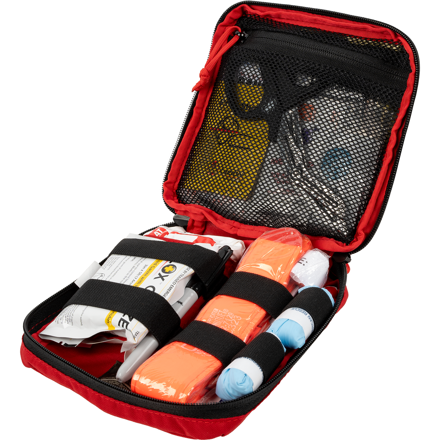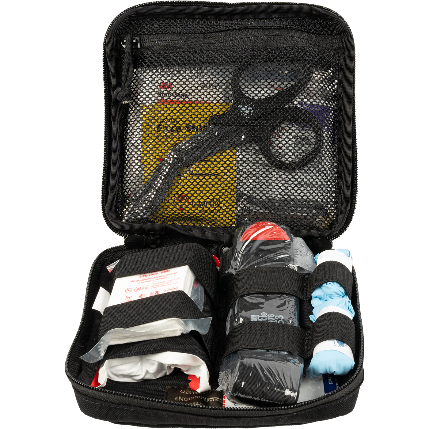 The Door Panel Kit was created in order to provide a compact, easy to stow major bleeding control kit that can be kept within reach when operating a vehicle. This low profile configuration allows the kit to fit into most common door panel pockets for easy access in the event of an accident or injury on the highway. Kit contents also offer other minor care solutions for stings, smaller lacerations, abrasions, and burns.