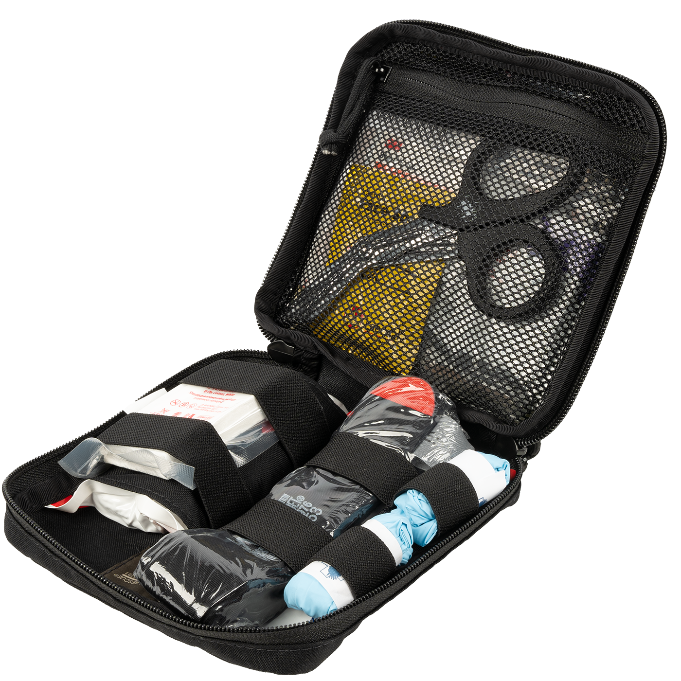 - Mesh pouch with zipper closure for easy visual location of items