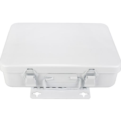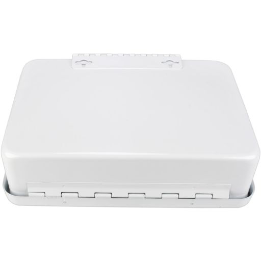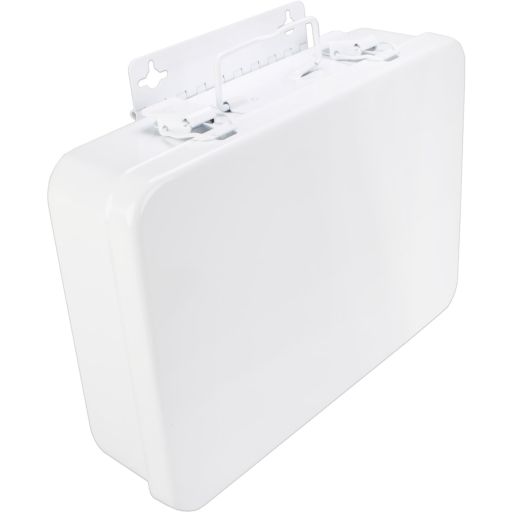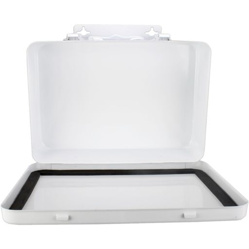 This horizontally configured empty metal first aid case features 1 shelf, hinges and a gasket. Holds up to 16-units of product.