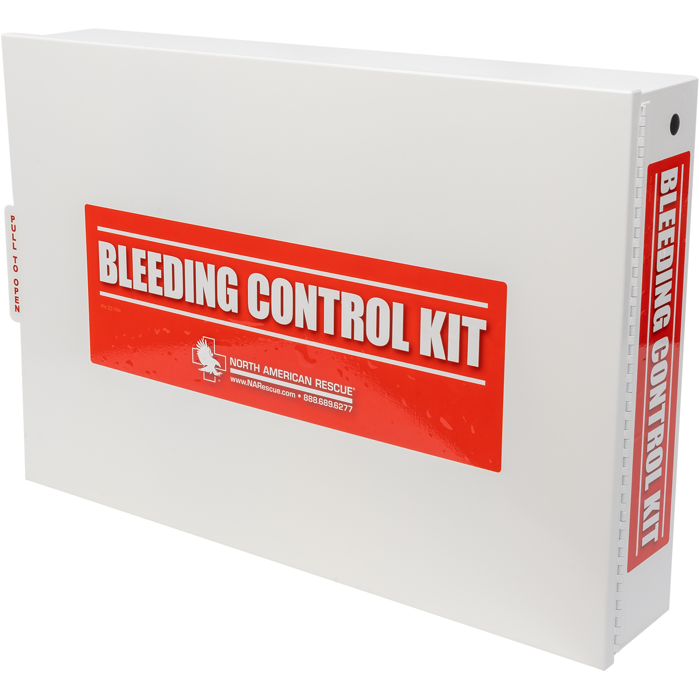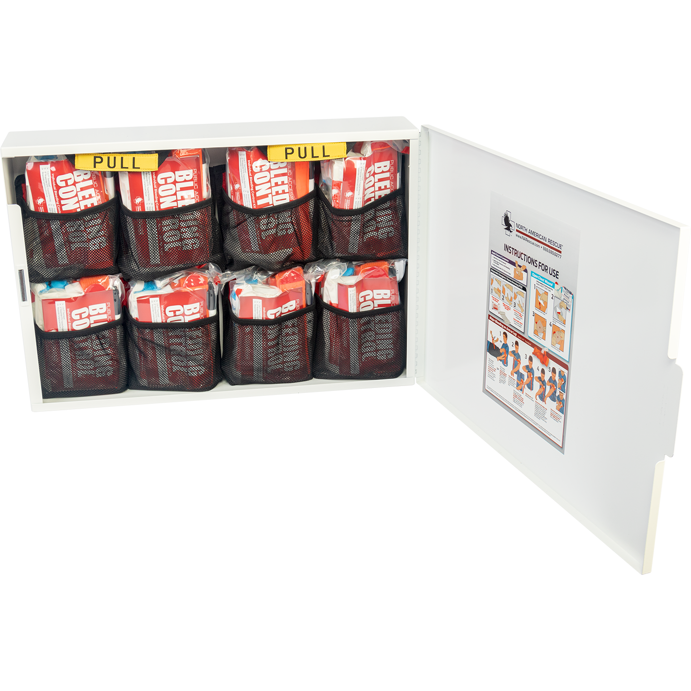 The first minutes following a traumatic injury are crucial in saving a life. Uncontrolled bleeding can result in death within minutes–even before emergency medical services or other emergency responders can arrive. North American Rescue® (NAR) Public Access Bleeding Control (PABC) Stations provide bystanders and initial first responders with quick and easy access to essential medical equipment to stop life-threatening bleeding in public buildings and populated public areas. This PABC Station includes a low profile metal wall cabinet equipped with eight (8) Individual Bleeding Control Kits (Nylon or Vacuum Sealed) stored in two (2) removable 4 Pocket Mesh Storage Panels with nylon pull handle. Designed to be mounted on a wall at a designated location or to be co-located with Automatic External Defibrillators (AEDs), NAR Public Access Bleeding Control Stations provide publicly accessible medical supplies to control major bleeding.