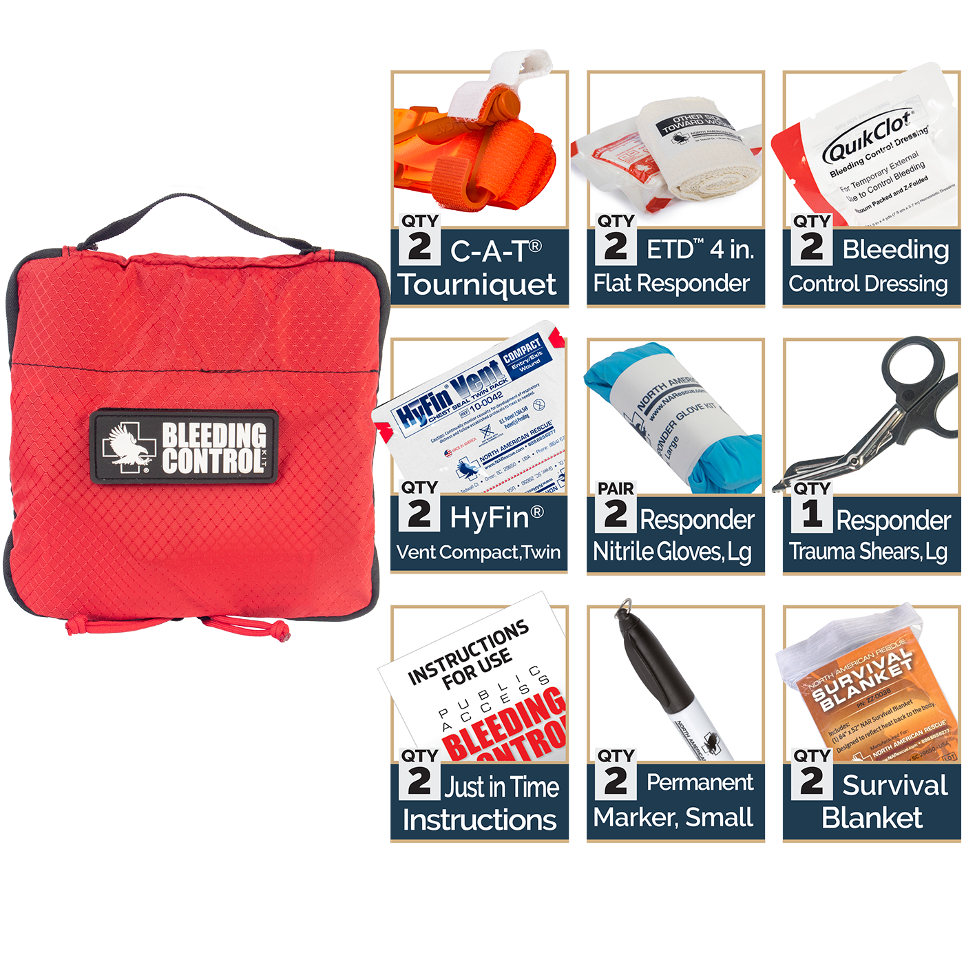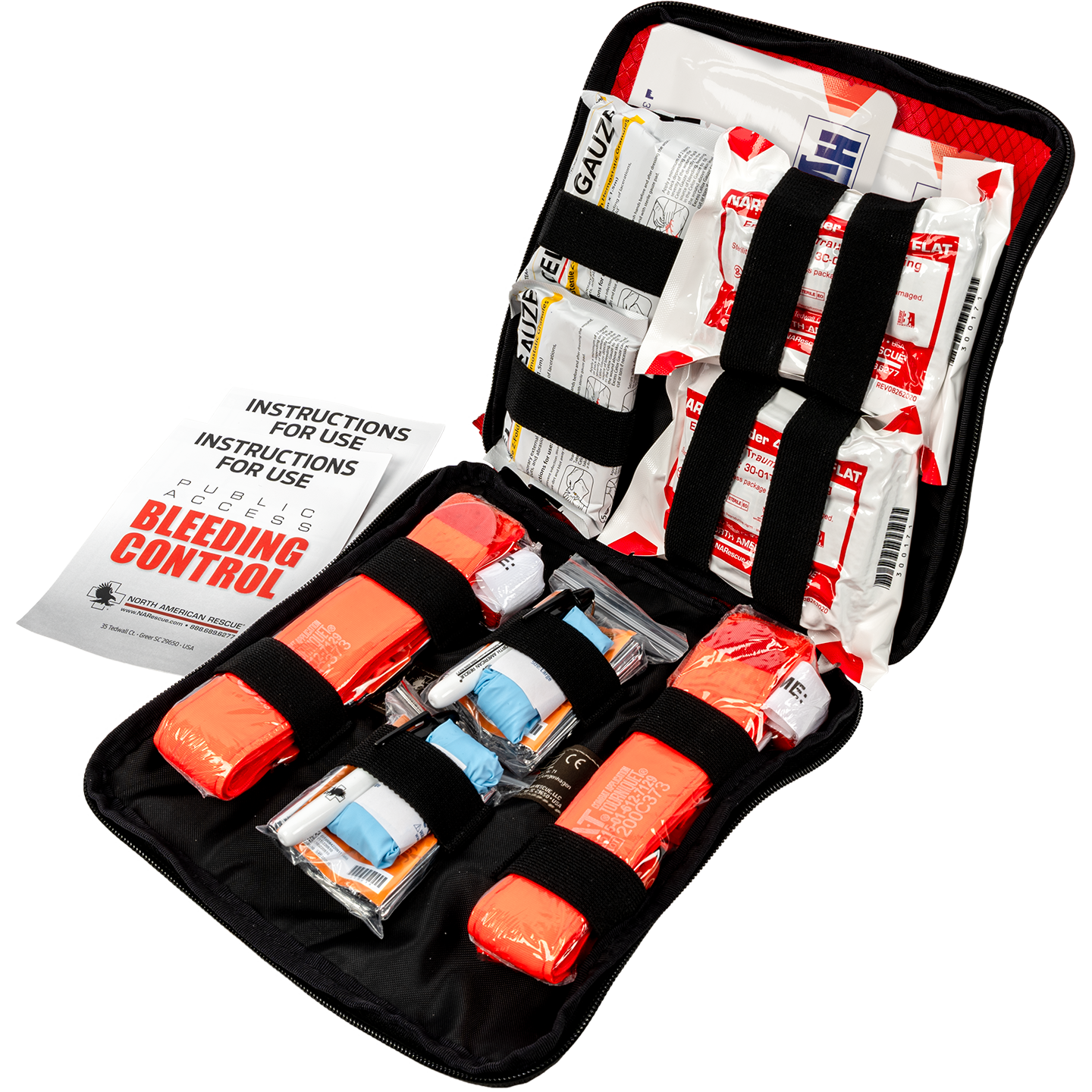 The first minutes following a traumatic injury are crucial in saving a life. Uncontrolled bleeding can result in death within minutes–even before emergency medical services or other emergency responders can arrive. The North American Rescue® (NAR) Public Access Bleeding Control (PABC) Twin Pack is designed to provide bystanders and initial first responders with quick and easy access to essential medical equipment for stopping life-threatening bleeding. The Twin Pack includes the contents of 2 Advanced Celox™ Gauze Individual Bleeding Control Kits contained inside one easy-to-open nylon carrying case that is designed to fit next to an AED in the cabinet.